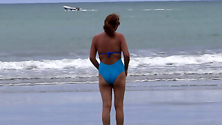 Mature cougar and her young daughter in a public fitting bedroom. Different swimsuits and mini bikinis on sexy big caboose.