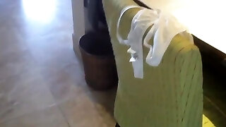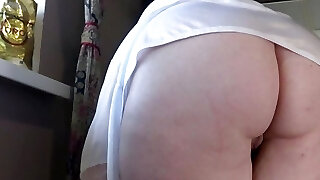 The camera watches the massive ass under the short robe of my mature stepmother. Lush milf in everyday life. Sexy bbw? PAWG.