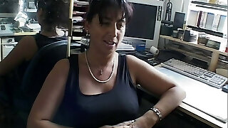 An outstanding mature monde in wonderful black lingerie is having 2 xxl cocks on her bosses office desk
