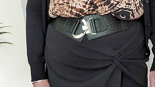 Going to work in a half-top, skirt ,stockings and heels. Ready for my younger boss to inspect my mature titties, ass and bald cunt.