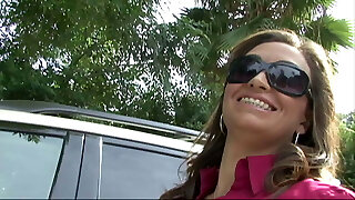 This brunette bitch Emma Culo got extra huge fake tits; she is wringing them and fingering her trimmed pussy.